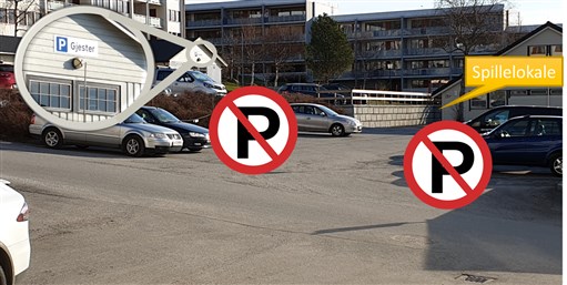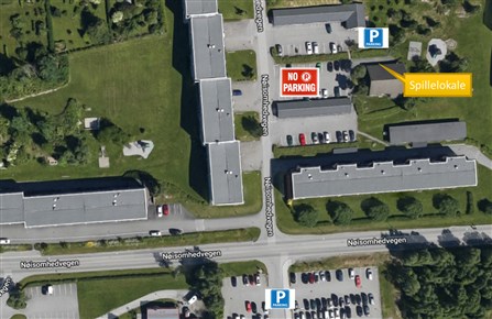 Det skal ikke parkeres på område rett utenfor spillelokalet (Se markeringen "No Parking" i bildet under.