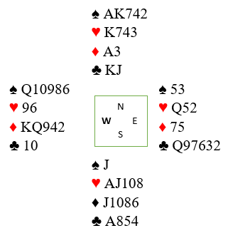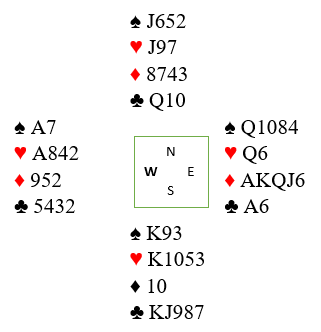 Over 2NT brukte Agnethe (syd) Puppet Staymen og de fant hjertertilpasningen. Mot 4 hjerter spilt av nord spilte øst ut spar til knekt, dame og konge. Sofie la opp til en krysstjeling ved å ta for kløver konge, ruter ess, den andre sparhonnøren så spar. Øst kastet ruter og syd fikk stjele. Så kløver ess, men vest stjal. Nå tror jeg riktig motspill må være trumfskift, og da blir det vanskeligere. Men da vest tok for ruter konge og spilte mer ruter stjal Sofie, og øst stjal over. Nå også virker det naturlig med trumfskift, men da det ikke kom fikk Sofie krysset hjem nok stikk til å notere ti stikk totalt, +620. Det ga 12 IMP inn i Nesoddens triumfferd som endte med den sensasjonelle seieren mot favorittene fra Bergen AK som spilte med et sterkt og særdeles erfarent lag. Triuemfen må være uendelig deilig spesielt for de to unge juniordamene som slo Sven Olai Høyland, deres mentor, trener og kaptein på juniorlandslaget.
