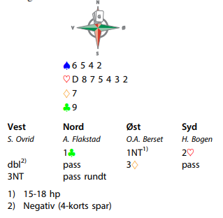 Hjemmelaget fra Mo BK spilte her mot de suverene norgesmestrene. Bogen hadde lurt innpå 2 hjerter over Bersets 1NT, og Bogens melding viser jo ikke bra kort (som det ville vist over en annen innmelding fra øst), med 9-10+ poeng ville han normalt ha doblet 1NT.