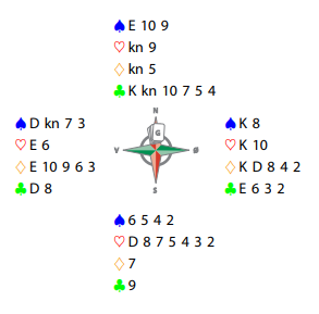 Hvordan spiller du 6 spar med hjerter ut til nords konge? Det ser ut som det bør gå greit ved rett og slett trumfe to hjerter hos nord. Kan det være farlig? Jo, selvsagt kan vest ha sekskorts hjerter så øst kan trumfe over den andre stjelingen, selv om spillefører er så forsiktig som mulig og ikke tar hjerter ess før han trumfer. Kanskje kan du trumfe med esset den andre gangen? Det går bra om bare ikke trumfen sitter 4-0.
