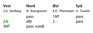 Siden Kvangraven passet i åpning og doblet vests Stayman 2 kløver fant Tundal kløverutspillet. Men det var en forskjell her, nord hadde ikke åpnet så han behøvde ikke ha spar ess. For å ha sjanse til å vinne kontrakten må spillefører spille spar før han tar sine to hjerterstikk, og han vinner kontrakten enkelt om syd har spar ess. Så det ble hva han naturlig nok satset på, men da kunne nord forsyne seg med alle kløverstikkene og det ble to bet. Dermed vant Sunndalsøra det spillet også, det var vanskelig å vinne IMP mot dem i den turneringen!