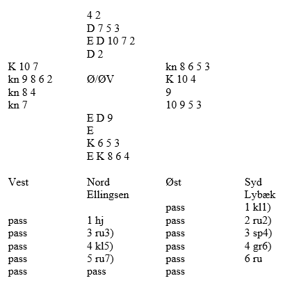 Nå handlet det mest om å finne ruterdame, men dette klarte den uheldige engerdøl overraskende greit. Makker putter dermed korta tilbake til mappa med et lurt smil, og den uheldige engerdøl visste godt hvem som ville henge i baren utpå kvelden og legge ut om den "steinharde storeslemmen" kun ett bord hadde meldt.