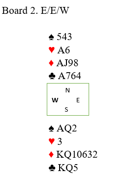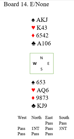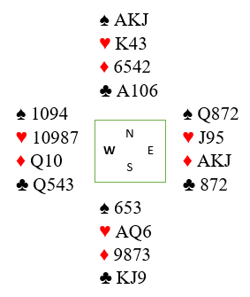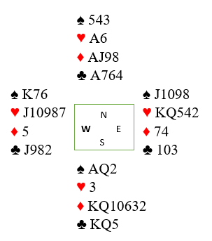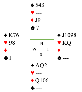 I første ruterrunde legger øst knekten, men vest stikker over med damen og skifter litt overraskende til hjerter 10. Du stikker og spiller mer ruter. Øst vinner med kongen og fortsetter med hjerter knekt mens vest følger med ruter 10. Så fargen satt 3-2 fra start. Inne igjen er du nå komfortabel med en stopper i hver majorfarge, og spiller en tredje runde ruter som går til østs ess mens vest kaster spar 9. Øst spiller en tredje runde hjerter som du vinner.