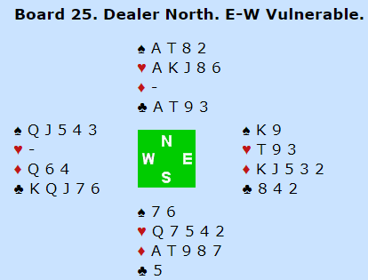 I dette spillet var Espen Flått-Christian Bakke det eneste paret som fant frem til 6 hjerter. Det er kanskje litt overraskende at ikke flere par kom i 6 hjerter, for N/S har en formidabel tilpasning, og i hjerterslem er det egentlig ingenting å spille om, Ø/V får et sparstikk.Om nord åpner med 1 hjerter har syd en hånd som er mye sterkere enn de faktiske honnørpoengene. Fortsettelse blir avhengig av system og hvilken støttemelding syd velger å avgi. Det skjer også ved mange bord at vest melder seg på med sin 5-5 hånd.