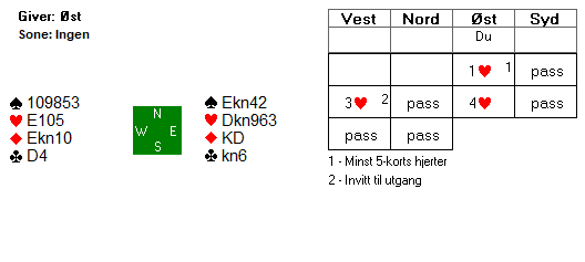 Å si 4 hjerter direkte som syd tror jeg er feil om avtalen er "standard", at det viser kun en svak hånd med veldig mange trumf. Et sånt hopp bør være innefor et ganske smalt styrkeintervall, for hvis det kan være nesten ingenting med fem-seks trumf en gang og en bra hånd neste gang blir det umulig for åpneren å vurdere om han har en sterk hånd. Hvis man spiller med minisplinter er det kanskje en aktuell melding (3 kløver), men hånden er såpass sterk at syd vil i utgang uansett. Kanskje er det nok til å vise en minimum Splinter hånd, 4 kløver (for eksempel). Som sagt, mye avhenger av system og avtaler, men også av av syds vurdering av kortene. Det er en syvtapers hånd i hjerterkontrakt, og et pluss kan ofte være mellomkortene i ruterfargen som kan gjøre at den fargen lettere kan godspilles (om kortene er annerledes). Altså, gode grunner til ¨å være optimistisk. Jeg har foreløpig ikke fått fatt i Flått-Bakke sitt meldingsforløp (så denne artikkelen kan blir oppdatert serene i dag), men de var altså alene om å notere meldt og vunnet slem, 13 IMP til Norge mot utgang ved det andre bordet.