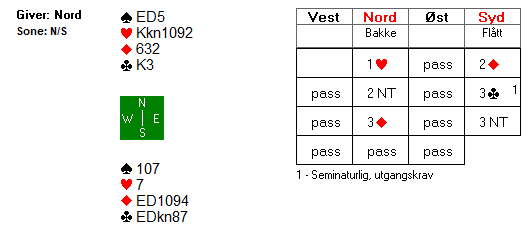 Christian Bakke la liten, og spilte hjerter til knekten på hånda. Øst stakk med dama, og skiftet til liten spar. Den gikk via nieren i vest til dama på hånda. Nå kunne Christian presse ut hjerter ess, og fikk hele elleve stikk da spillet så slik ut: