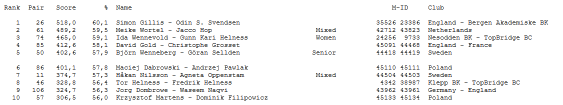 Etter første dag av Marit Sveaas International Bridge Tournament, som spilles side om side med Ungdoms-EM i Oslofjord Arena, er det Simon Gillis (England) og Odin S. Svendsen som har kommet best i gang. De leder foran Meike Wortel og Jacco Hop (Nederland) og Ida Wennevold og Gunn Kari Helness. 125 deltar, og mange toppspillere, både nasjonale og internasjonale deltar. Men turneringa appellerer også til flere enn den ypperste eliten i og med at det er egen handicap-premiering og dessuten flere premiekategorier som veteran, damer og mix.