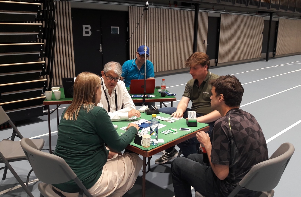 I siste runde fredag møttes parene som ligger på første- andreplass på bord 1. Fra venstre Meike Wortel, Simon Gillis, Jacco Hop og Odin S. Svendsen.