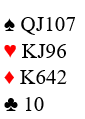 Et forslag er å stikke over kløveren å returnere ruter 10. Da vil du åpne muligheten for å få ei ruterstjeling. Forutsatt at spillefører har dobbel kløver holdes forbindelsen til makker i kløver åpen slik at han kan få gitt deg ruterstjelinga.
