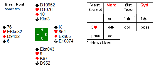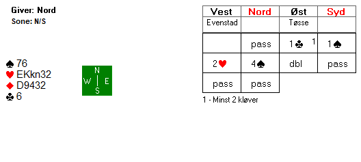 Nicolai valgte sin single kløver, og dermed fikk forsvaret takket være to kløverstjelinger tatt de fem første stikkene for 500 inn da hele spillet så slik ut: