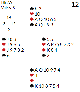 Min makker spilte ut spar ess fulgt av spar til min konge. Jeg visste ikke med sikkerhet at syd hadde kun en hjerter (husk østs hånd er skjult) og tenkte at å gi makker en ruterstjeling hvis hun satt med singelton var tingen, eventuelt to stjelinger hvis hun var renons i ruter og hadde to trumf. Kløver ess gir jo ett inntak til. Så ruter ess ble spilt fulgt av ruter til stjeling, men siden det var den eneste trumfen hun hadde ble det kun ett stikk til, kløver ess. Det ga kun +1100, og selv en bet til ville vært mindre enn vår mulige score i sparslem. Det ble likevel en del poeng for 1100, deling med en god del par, og bedre score enn de som ikke var i slem. Jeg tenkte ikke over det med det samme, men da spillstensilen ble utlevert så jeg av dataanalysen at det går an å få tak i +1400 mot 7 hjerter, og det er «par-score», dvs. det maksimale på spillet om alle spillerne gjør alt riktig.