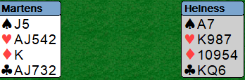 Helness fant et godt trumfutspill mot 4 spar doblet, og ZIMMERMANN noterte +200 der spilleren ved det andre bordet med nordmannens kort spilte ut ruter konge fra K-Q-10-x. Trumfutspillet var best, og etter ruter konge ut ble utgangen vunnet.