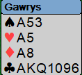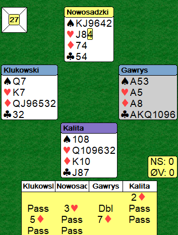 Hva ville du meldt etter 2 ruter – Multi – fra syd, pass fra vest og 3 hjerter pass/korriger fra nord (han sperrer med tilpasning både til spar og hjerter hvor syd har vist en lang majorfarge). Gawrys mente han var for sterk for bare å si 3 grand, og det hadde han rett i, men da han doblet, og vest etter pass fra syd spratt i 5 ruter tok han litt for hardt i da han sa 7 ruter.
