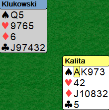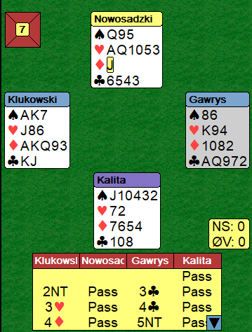 Klukowskis 3 hjerter benektet major, østs 4 kløver var naturlig, og 5 grand «pick a slam».