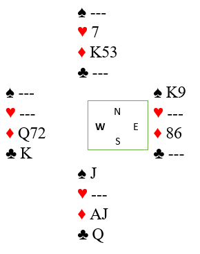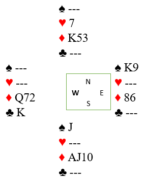Et klønete påkast spør du meg, for om spillefører tror på det (at vest faktisk har A-K) så kan han spille på dobbel-squeeze ved å gi opp mellomruterne hos syd mot slutten! Han spiller seg da ned i denne posisjonen:.