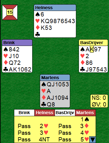 Bas Drijver for lag BLASS hørte 2 hjerter – svake 2 – og 2 spar fra nord, naturlig. Nederlenderen sa simpelthen 3 grand, og da hadde han misset en iskald lilleslem, i alle fall i ruterkontrakt (eller grand) spilt av vest. Men hva gjør det, likevel vant de 11 IMP.