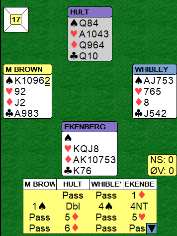 Ved nesten alle bord meldte vest inn 1 spar og øst hoppet til 4 spar. Jeg liker godt Simon Ekenberg sine meldinger her selv om det gikk ut over mitt lag. Først 4 grand som sier han har to steder det kan spilles, ofte med seks ruter og fire kløver (melder normalt 5 kløver med 5-5 i minor). Hvis makkeren sier 5 kløver tar han ut i 5 ruter med dette og sier han har ikke kløver ved siden av, men hjerter og ruter. Idet nord støttet ruteren meldte altså Ekenberg 5 hjerter, og nå hadde han avgitt en kraftig sleminvitt som nord tok imot med de perfekte verdiene han hadde, og nord kunne jo se at syd måtte være kort i spar (trolig renons).