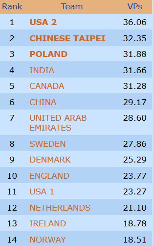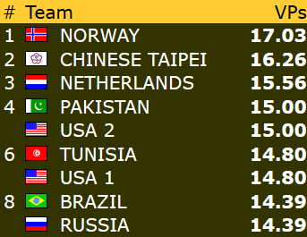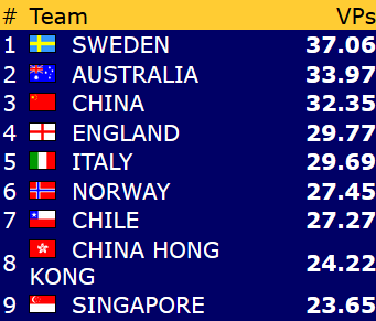 Også i dameklassen leder Norge åpningskampen takket være storseier mot Hong Kong. IMP-sifrene 48-6 var nok til at de norske damene fikk med seg drøyt 18 vinnerpoeng. Veteranene fikk dessverre ingen god start. Det ble et relativt klart tap mot Taiwan (12-38 i IMP/3,91-16,07 i VP). Heldigvis er det mange kamper igjen.