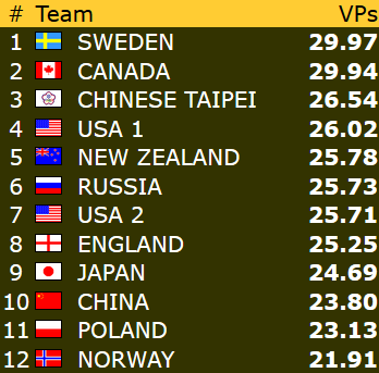 Det begynner å se lyst ut for de norske farger i OPEN og LADIES selv om det er langt igjen, kvalifiseringen er så vidt halvspilt. Begge lagene spiller veldig solid, og det er vanskelig å se noen svakhetstegn i det hele tatt. Ting kan snu seg fort, men jeg tror dette ordner seg og vi får to norske lag i sluttspillkamper i neste uke.