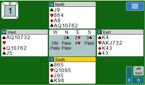 Ann Karin Fuglestad og Marianne Harding fant frem til 4 hjerter etter åpning 1 kløver fra nord, og der ble det ti stikk og +620. Spillet ga 14 IMP til Norge som tok ledelsen i kampen. Kontrakten 4 hjerter ville dog gått en bet om det spilles ut kløver er imidlertid.