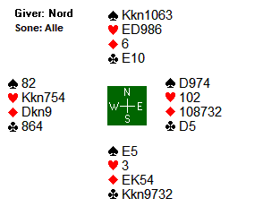 Med Tolle (S) og Leif Erik (N) stampet Ø/V i 5 hjerter over 4 spar. Mot den doblede kontrakten kunne Tolle ha spilt ut spar dame som ville gjort at forsvaret får et voldsomt overtak siden de kan korte spillefører i trumf. Tolle valgte imidlertid å spille ut det normale, en liten spar. Da får spillefører en slags kontroll ved å legge liten slik at han får en sparstopper. Det blir fortsatt flere doblede bet noe som skjedde enkelte steder hvor Ø/V fant den veldig spreke stampemeldingen i hjerter (kløverkontrakt er en del bedre).