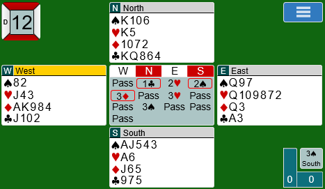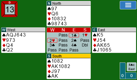 2 kløver fra Nils var presisjon, opp til 15 honnørpoeng og minst 5-korts kløver. Guadeloupe havnet etter hvert i 4 hjerter. Det var ingen optimal kontrakt. Sjansene var langt bedre i sparkontrakt. Heldigvis meldte Allan og Terje seg fram til 4 spar. Hvordan det skjedde er imidlertid uvisst da det ikke er loggført på BBO. Om motparten starter med to kløverstikk, må trumfen løses uten taper og ruteren med én taper. Slik det sitter er det rimelig å fikse dette.