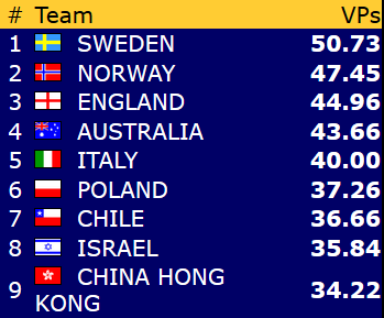 Dagens resultater i åpen klasse: Norge - Guadeloupe 20 - 0 (IMP-score: 78 - 7) Norge - Bangladesh 7,45 - 12,55 (IMP-score: 38 - 47) Norge - Kina 20 - 0 (IMP-score: 72 - 11)
