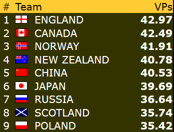 Etter dagens resultater er Norge dermed 4,7 VP bak mitt skjema til å nå sluttspill (justert etter motstand).