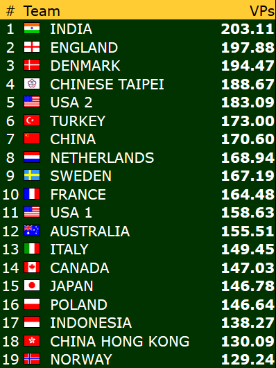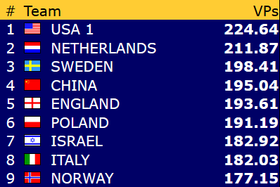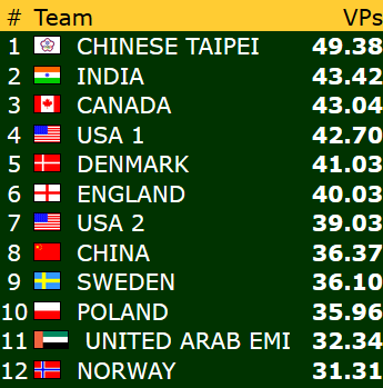 I åpen klasse og dameklassen har Norge fått en flott start på VM i Wuhan. Begge lagene har to storseiere og ett klart tap. Også veteranene har to seire og ett tap, men den samlede VP-sankinga har vært lavere enn for de to andre lagene. Uansett henger alle våre lag godt med i kampen om avansement til sluttspillet etter tre av 24 kamper. Vi er så vidt i gang, men det er aldri en ulempe å få god start. Under følger resultatene fra første dag og stillinga så langt (klikk på overskriftene for komlette resultatlister).