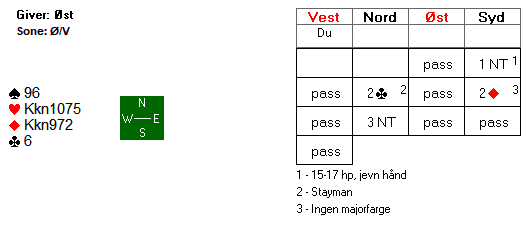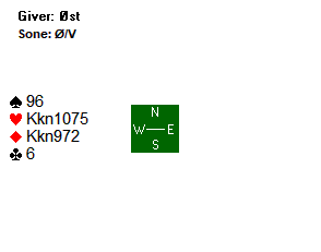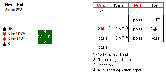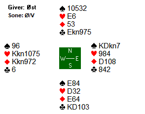 Som du ser er det åtte toppstikk i kontrakten. Det er i bunn og grunn bare en mulighet for det niende stikket, og den ligger i at spillefører får stikk for hjerter dame. Med hjerter ut fra vest, kan spillefører bare legge liten i bordet, og med det sikre ni enkle stikk. Med alt annet ut vil det bare bli åtte stikk på spillefører.