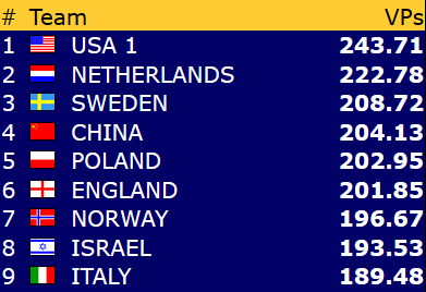 Vårt lag startet turneringen fryktelig, men kom bra tilbake før vi skulle opp mot mine landsmenn. Og det gikk kiwienes vei. Kampen endte som de fleste nok har fått med seg med 30 IMP seier i favør New Zealand. Det var et ubehagelig resultat for Norge som hele tiden har vært i posisjon til å kunne kvalle til sluttspill, mens nesten 17 VP bidro til at det fortsatt er et lite håp for avansement for New Zealand som ligger på 11.plass før fredagens spilling. Norge slo tilbake i runde 15 og ligger på 9.plass like bak Italia på 8.plass.