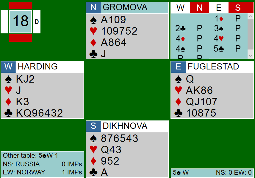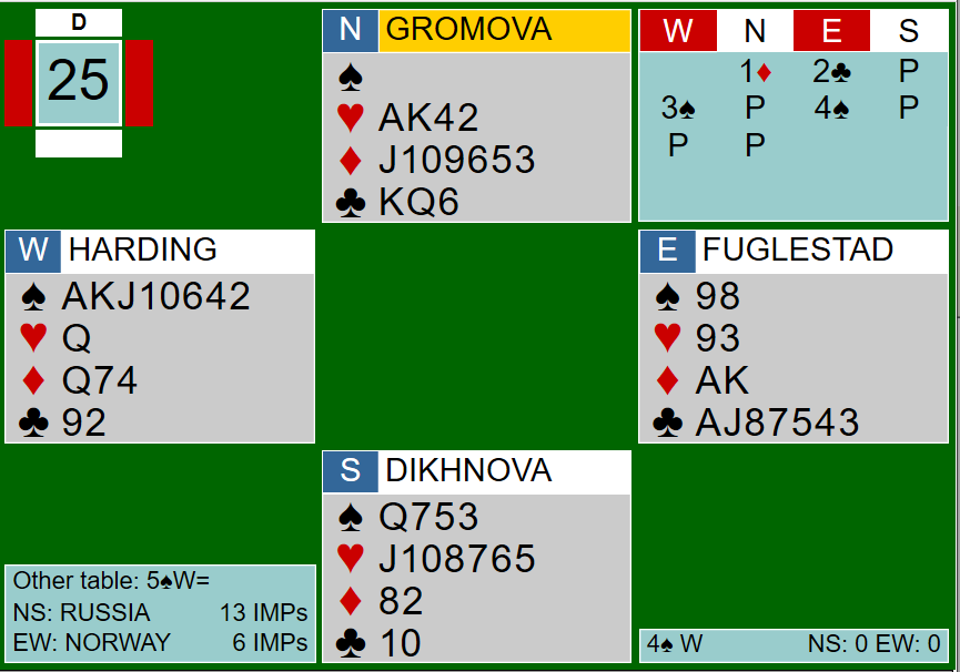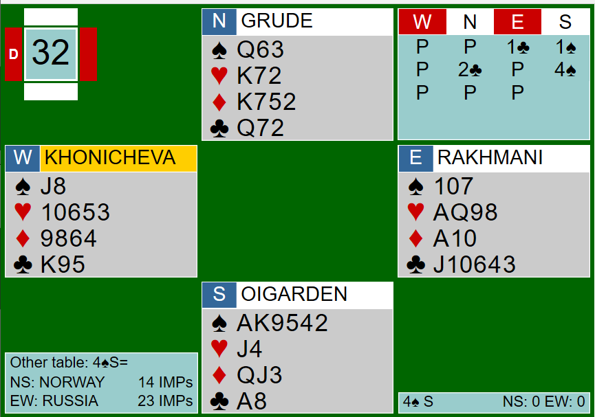 Dessverre for Norge fant Khonicheva utspillet. Ved det andre bordet ble det spilt ut ruter, og dermed 10 IMP til Russland.
