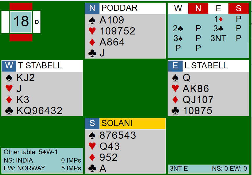 I et tidligere spill stoppet Brogeland-Lindqvist litt overraskende i 3 hjerter hvor utgang så bra ut, men det var bare ni stikk da forsvaret kunne få en kløverstjeling. Det norske paret hadde altså gjort det riktige - i teorien. Ved det andre bordet var NZ i utgang, men da det ikke kom kløver ut fikk ikke forsvaret stjelingen og utgangen føk hjem - utgangsving til New Zealand.