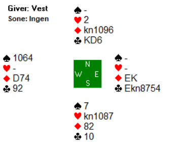 For Norge sitt Ø/V-par ble det ikke så attraktivt å være med etter nords bløff(?)åpning, og syd fikk spille 2 hjerter som gikk en bet.