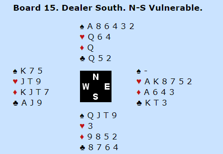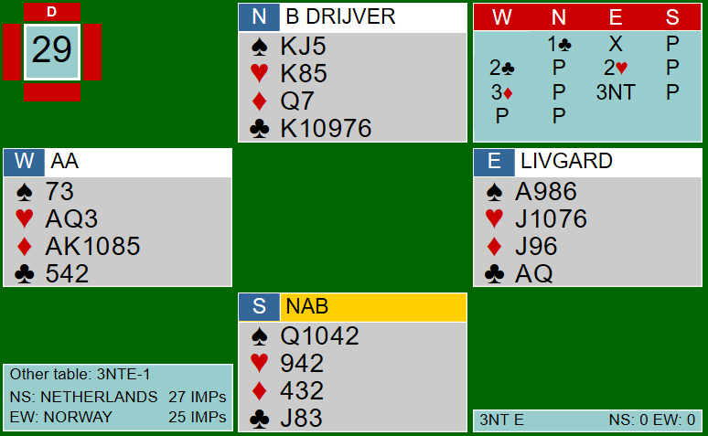 Etter en feil i motspillet gikk denne kontrakten til slutt hjem. Vest startet med tre runder ruter til stjeling. Terje Aa tok dereter ut trumfen i tre runder før han spilte kløver konge. For å beite kontrakten må vest lasjere. Da han stakk og kløver dame kom på fra øst, hadde Terje plutselig inntak til en bråte med kløverstikk i bordet og fikk dermed saket hjerter dame. Syv IMP til Norge.