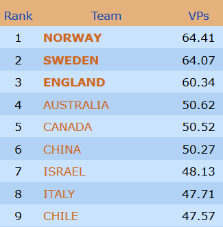 I OPEN hvor Norge ligger på 7.plass er det over 8 VP ned til den triste niendeplassen, det første laget som ikke går videre.