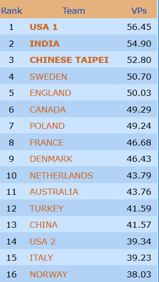 Vi fikk to pene seiere i går mot sterke Polen og USA 2. Mot India som ligger under middels ble det tøffere. Her et spill som kunne vippet begge veier før det ble nesten uavgjort:
