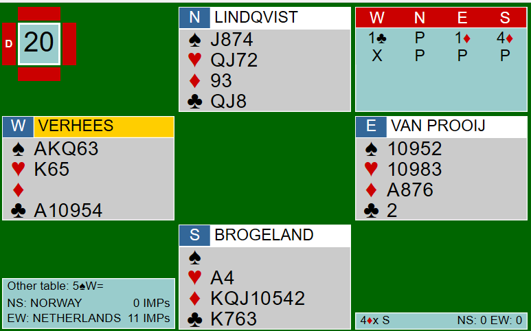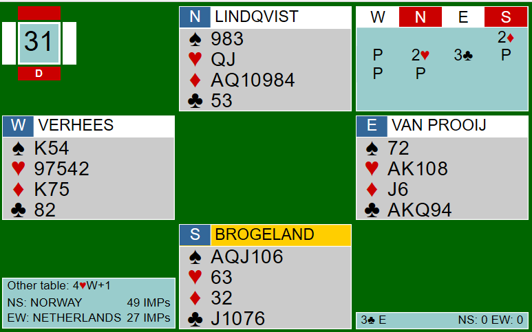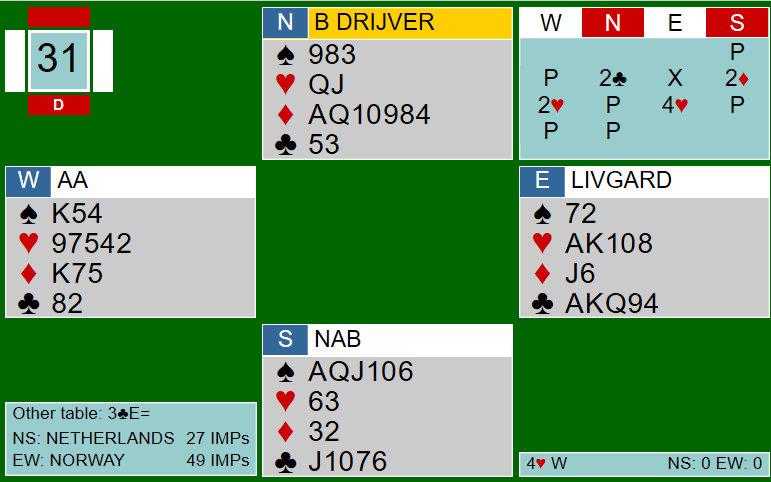 Ved det andre bordet spilte nederlenderne med sterk kløver. Etter innledninga 1 kløver - 1 ruter gikk Boye inn med 4 ruter i syd: