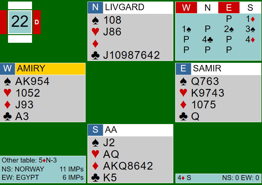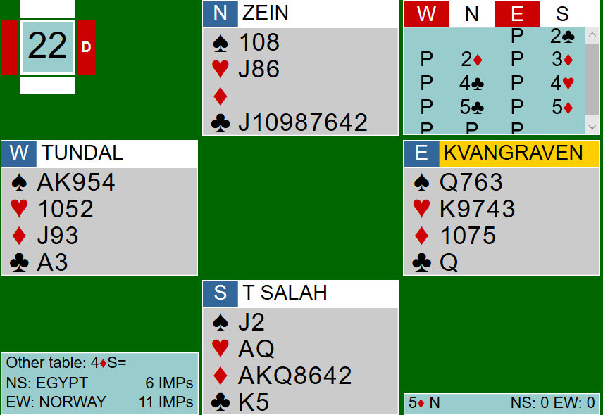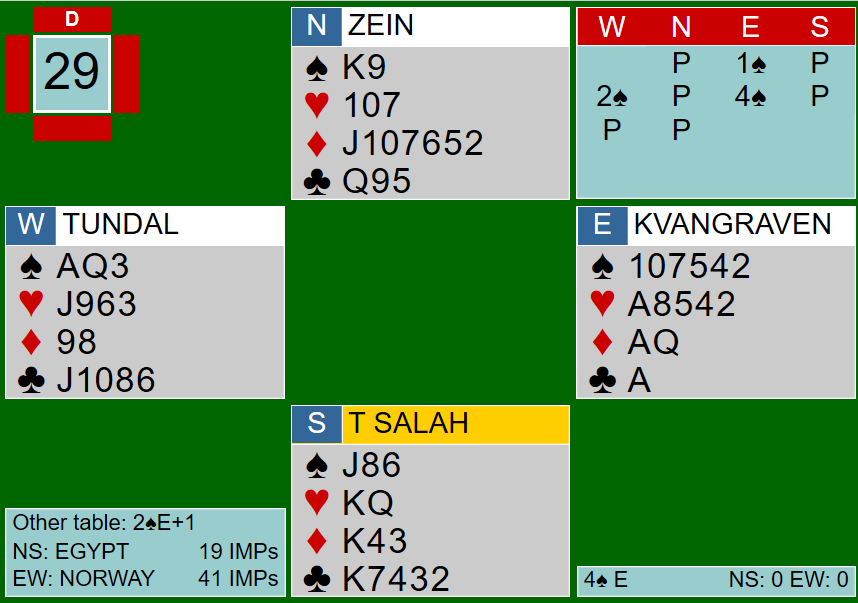 Nord var imidlertid fristet til å få ei stjeling i hjerter, og spilte dermed hjerter til makkers dame. Problemet var bare at makker ikke hadde flere hjerter å spille. Syd fridde seg med en trumf, og da den satt 3-2 var utgangen hjemme. Motparten kunne ikke få mer enn ett trumfstikk til. Nils presset bare høye hjerter. På håndas femte hjerter forsvant rutertaperen i bordet. Syd kunne trumfe når han ville, men bordets siste trumf kunne brukes til å trumfe ruter dame. Dermed ti stikk og ti IMP til Norge da Egypt stoppet i delkontrakt ved det andre bordet.