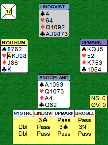 Som du ser var det mer dramatikk og større score var en mulighet da Nystrøm doblet 3 grand og han ikke fant sparskiftet! Etter en stor hjerter i utspill skiftet han til kløver konge. Nå var det åtte toppstikk og kontrakten kunne vinnes ved å tippe ruteren. Brogeland spilte imidlertid liten til ruter ess fulgt av liten til damen da han ikke unaturlig satset på ruter konge hos dobleren. Da ble det en doblet bet, -100 og et av disse «kjedelige», uavgjorte spillene!