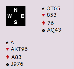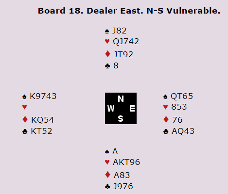 Liv Marit (nord) og Bodil meldte seg opp i 6 hjerter etter en renonsvisende splintermelding i nord. 5 hjerter viste så to av fem ess uten hjerterdama. Utspillet var spar dame, som gikk til stjeling i bordet. Bodil fortsatte med ruter til stjeling, kløver til knekten og ny ruter til stjeling. Da kongen kom på fra øst sto kontrakten nå bare på at hjerteren var jevnt fordelt. Hjerter konge og hjerter til esset ga gode nyheter, og nå var det bare å pumpe stående ruter fra bordet. Vunnet lilleslem og 11 IMP til Norge da Nederland stoppet i utgang ved det andre bordet.