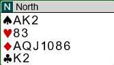 Jeg tror det riktige er å fastslå at makkers litt uventede utspill er en singelton omtrent hundre av hundre ganger. Hvorfor vil han ellers blindt spille ut en umeldt farge etter at egen side har meldt og støttet hjerter? Det var overaskende å se at mange på syd sin plass forsøkte en stor hjerter da de var inne på trumfesset. Da føk kontrakten hjem i full fart siden hele spillet så slik ut: