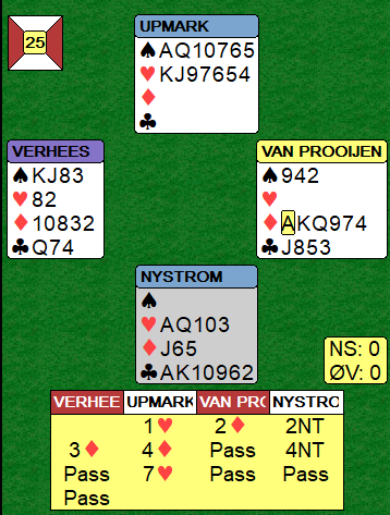 Hvis du åpner med 1 hjerter vil også øst melde inn ruter, og makker på syds plass vil på en eller annen måte, avhengig av system og avtaler vise en god hånd med hjerterstøtte. Igjen vil du til slem. Problemet er bare at du er redd for at det står nedlegg i 7. Hvordan finne ut det med sikkerhet. Tross alt behøver nord omtrent ikke mer enn esset fjerde i hjerter hos syd for at det kan være tretten stikk! Men det behøver ikke stå i storeslem, og det er ingen melding som fortelle nord at syd har de riktige honnørene.
