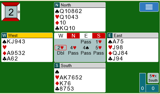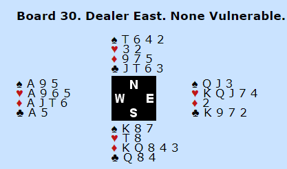 Dette neste spillet er mer normalt, og det er for å være ærlig en ganske standard lilleslem i hjerter. Men noen meldte 7 hjerter som ikke ser bra ut, og ved første øyekast er det ikke så lett å se hva som må til for å kunne vinne alle tretten stikkene.