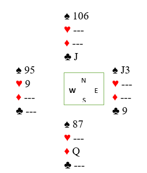 Da trumfes en tredje ruter hos øst og det kan (for eksempel) spilles to runder trumf og over til vest før den siste ruteren trumfes. Reverse-dummy operasjonen er i boks, det er tolv sikre. Fortsettelsen blir å ta en kløverstjeling med vests nest siste trumf, og den stjelingen gjør at nord blir alene om kløverholdet. Dette har blitt siutasjonen: