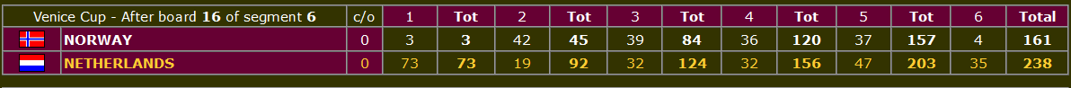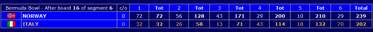 De norske spillerne utklasset Italia første dag, men i siste halvdelen av kvartfinalen var det Italia som utklasset Norge! Italienerne var imidlertid ikke så overlegne som de norske var i de 48 første spillene, og Norge vant til slutt kampen med 37 IMP. Det høres ganske komfortabelt ut, men i slike kamper svinger det voldsomt når et sterkt lag kommer i dytten. Så det ble spennende selv om siste del av den kampen ikke ble overført på BBO, antagelig fordi det så ut som om det var over da de var halvveis!