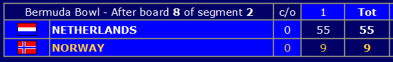 I dameklassen ble dessverre Nederland for sterke for Norge. Da de norske damene tapte første kvartfinalesett med 70 IMP ble det selvsagt vanskelig å gå videre, men langt fra umulig, og de ga seg ikke uten kamp. Etter å ha vunnet de tre neste settene var avstanden nede i 29 IMP før de siste 32 spillene. Begge disse settene ble imidlertid vunnet av nederlenderne.