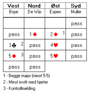 Boye passet faktisk i andrehånd med 12-poengeren i vest. Etter at Espen hoppet ut i 4 hjerter følte Boye at han hadde til å gå på en gang til. Denne gang hadde Espen strukket seg Med en sikker kløvertaper har man bare råd til én taper i trumf. Med aktuell sits lot ikke det seg gjøre. Dermed ble det beit i 5 hjerter. Nederland spilte 4 hjerter med ti stikk ved det andre bordet, og dermed kunne de notere 10 IMP til i sin kolonne.