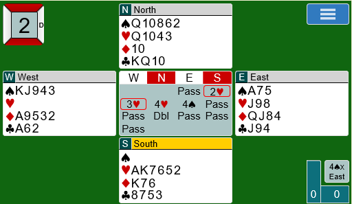 Hvis du åpner med 1 spar melder øst inn 2 ruter (noen steder 3 ruter). Makker dobler og viser overraskende for nord firekorts hjerter, men ikke nødvendigvis så mange HP. Det spiller ingen rolle, tilpasning til en farge er nok for nord til å vite at slem bør spilles. Men hva melder du nå?