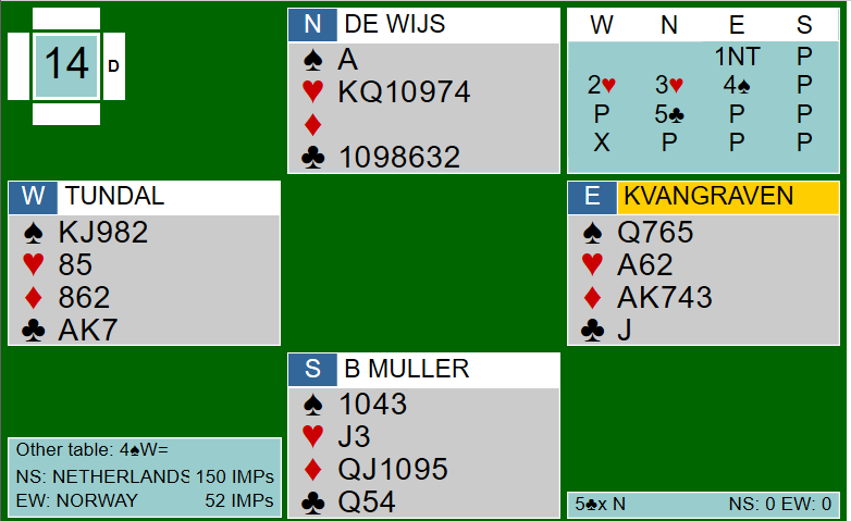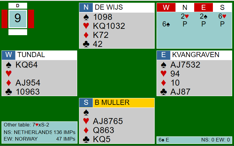 Ved det andre bordet var de fire første meldingene identiske, men nederlenderen i nord fant det for godt å meldte en gang til på sparfarga si: